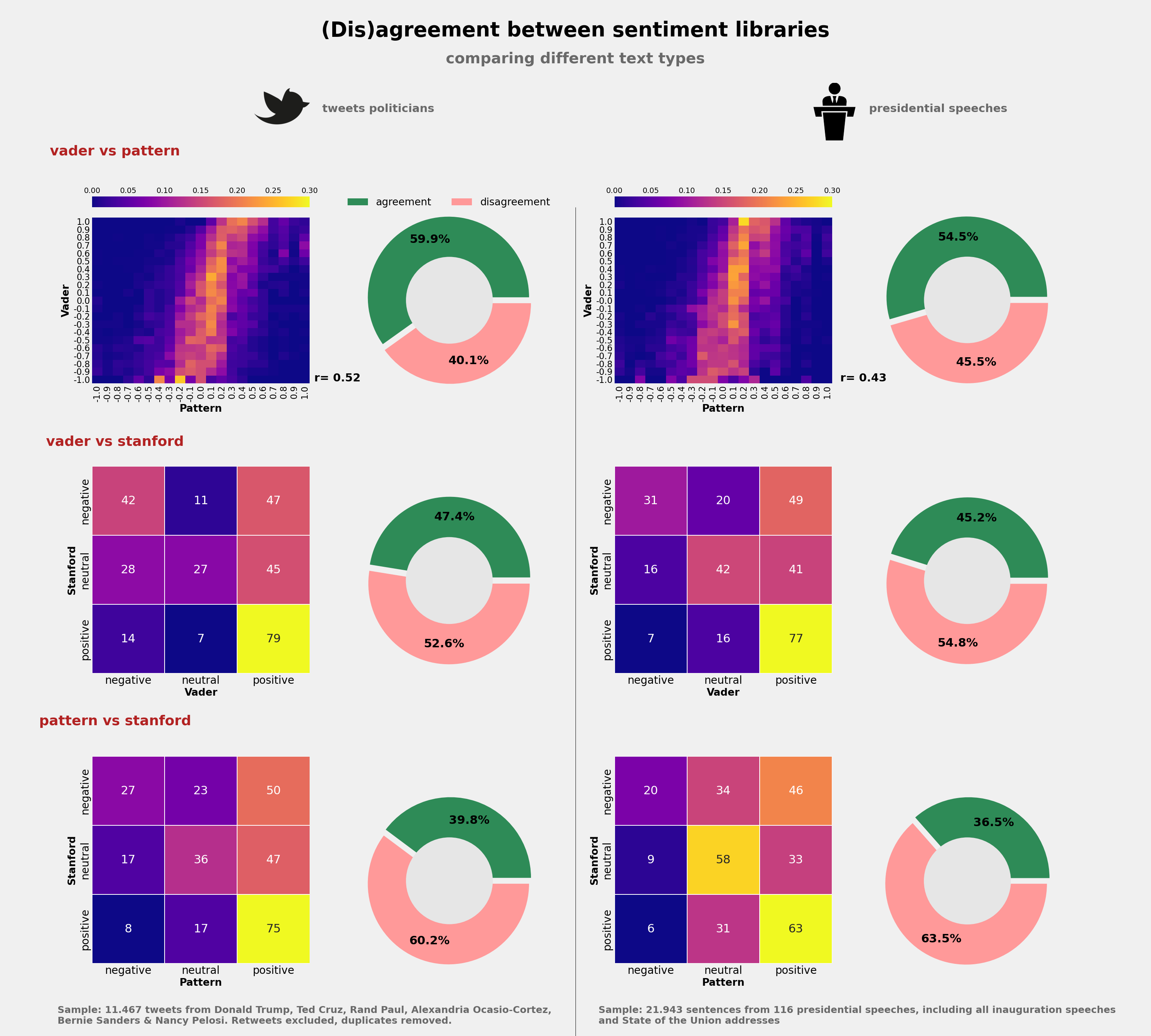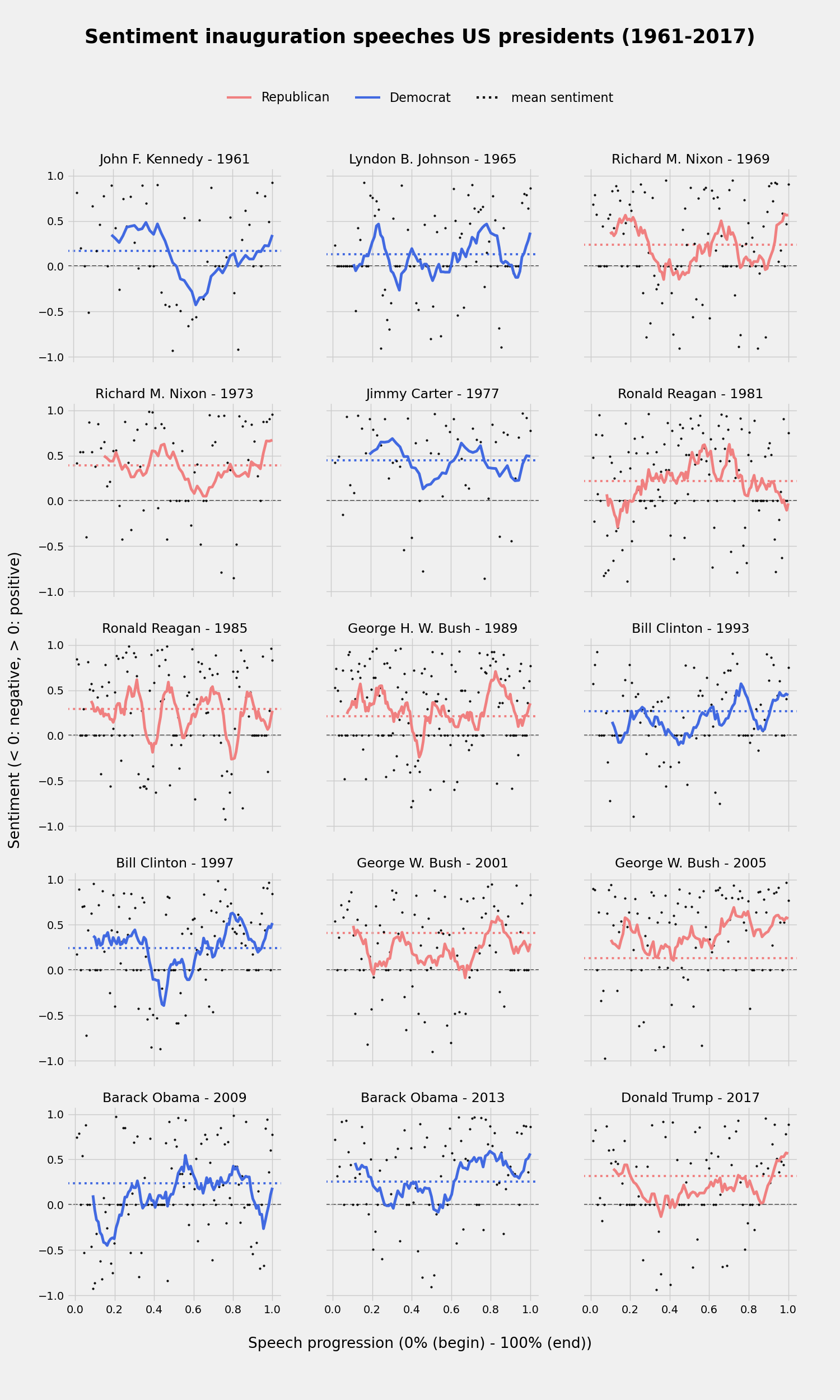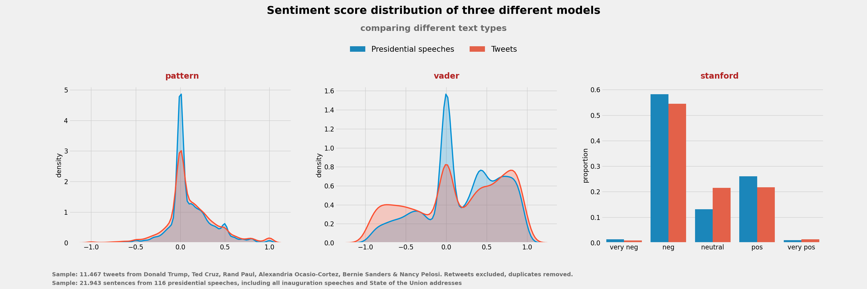 **Context** - These datasets were produced as part of a little research project I undertook for a blog post on sentiment analysis, which you can access here: https://bit.ly/32PmWdf - I uploaded a more extensive dataset of presidential speeches on Kaggle here: https://bit.ly/2E7Fmvw **Content** The datasets were created to compare sentiment scores across two text types (tweets versus political speeches) and three sentiment models (Pattern, Vader and the polarity model incorporated in Stanford CoreNLP). ***- sentiment_speeches_Kaggle.csv: *** The dataset contains sentiment codings (Pattern,Vader & Stanford model) for al inauguration and state of the union speeches of US presidents since 1917 on sentence level. **-sentiment_tweets°Kaggle.csv:** The dataset contains sentiment codings (Pattern,Vader & Stanford model) for a sample of around 11500 tweets of US politicians (Donald J. Trump (Rep.), Rand Paul (Rep.),Ted Cruz (Rep.), Alexandria Ocasio-Cortez (Dem.), Nancy Pelosi (Dem.) and Bernie Sanders (Dem.)). The sentiment polarity has been computed on tweet-level, not sentence-level. I simply scraped the last 2000-ish tweets of each timeline using the GetOldTweets module for Python. You can read more about the data collection process in the aforementioned blog post (https://bit.ly/32PmWdf). **Distribution of sentiment scores**  ** Some example analyses ** - The fact that the analyses of presidential speeches has been performed on sentence-level makes an analysis of polarity-development within the same text extremely easy. For example, one can easily plot the polarity scores across a single inaugural speech, like I did here for the inaugural addressees since JFK:  - One could also compare how these models code a particular tweet or speech and index the amount of (dis)agreement betwene the different models:  You can read more about the data collection, wrangling and analysis process in the aforementioned blog post.